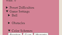 Added support for WASD. Menu added. Menu includes Ball Settings, Obstacle Settings, Color Schemes, and a win counter. Changed Preset Difficulties and Game Settings save after death unless the game is...